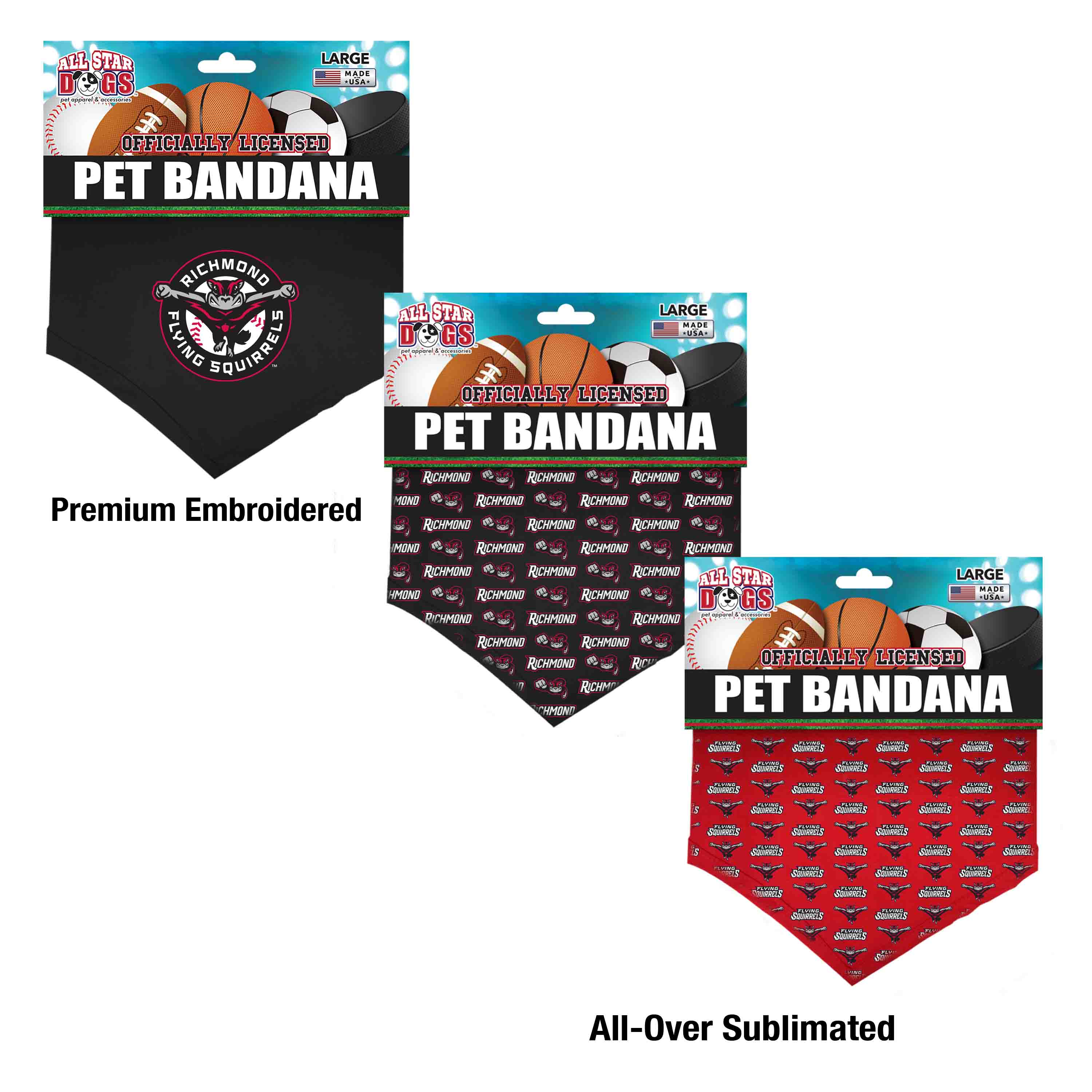 Cotton Shirting pet bandana with embroidered team logo. Also available as all-over print sublimated poly blends.
