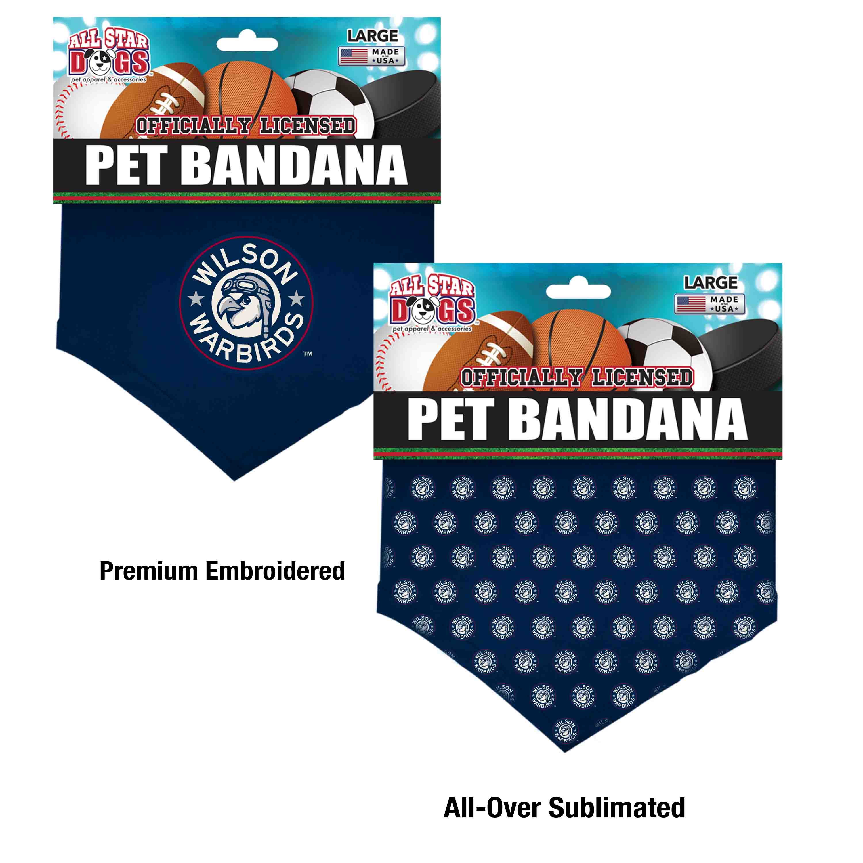 Cotton Shirting pet bandana with embroidered team logo. Also available as all-over print sublimated poly blends.