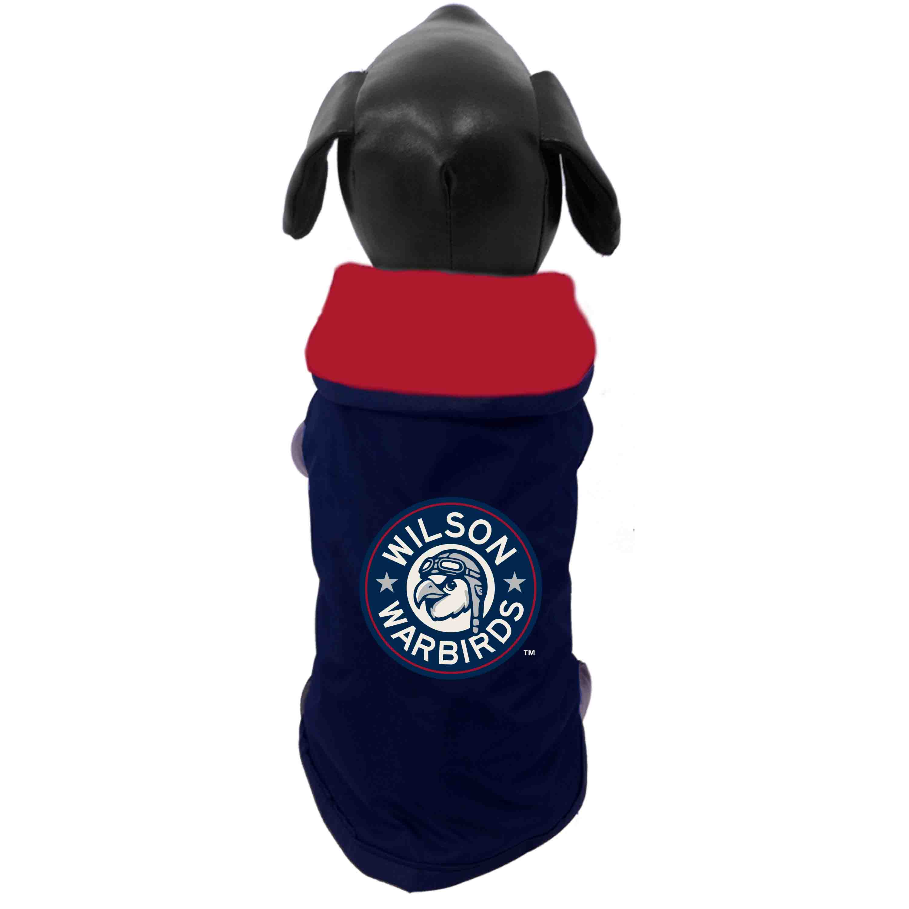 Water and wind resistant pet coat with polar fleece lining and embroidered team logo.
