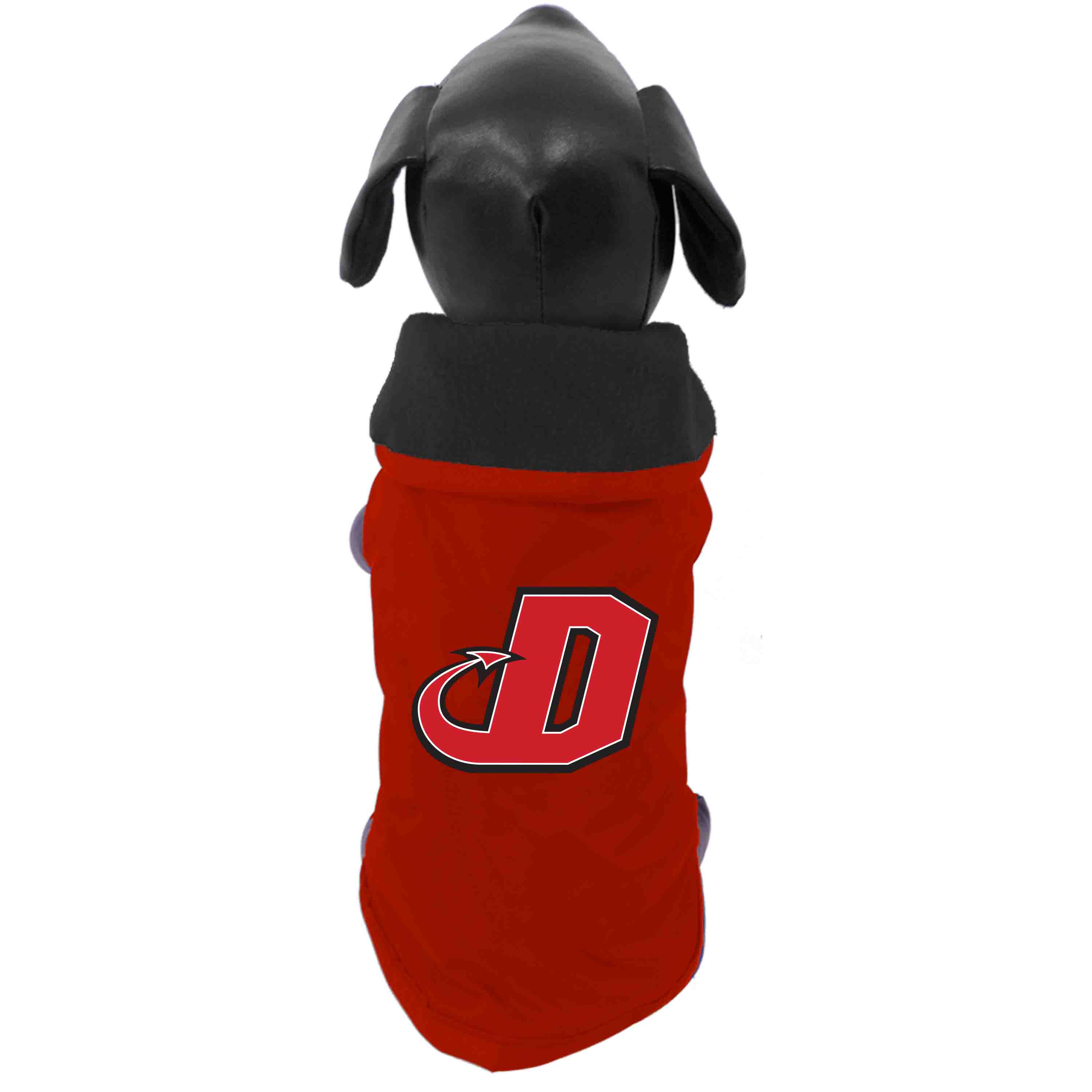 Water and wind resistant pet coat with polar fleece lining and embroidered team logo.