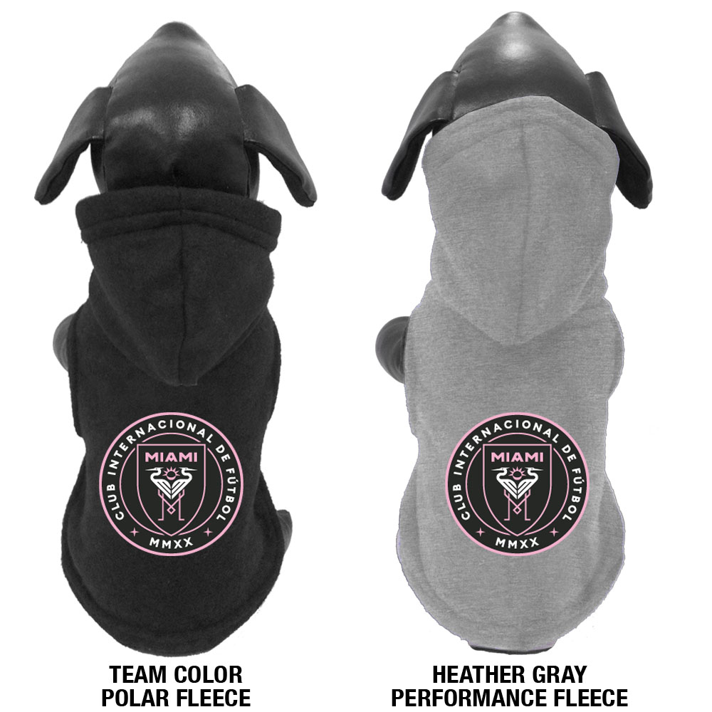 Heavy Polar Fleece hooded pet jacket with leash opening and embroidered team logo.