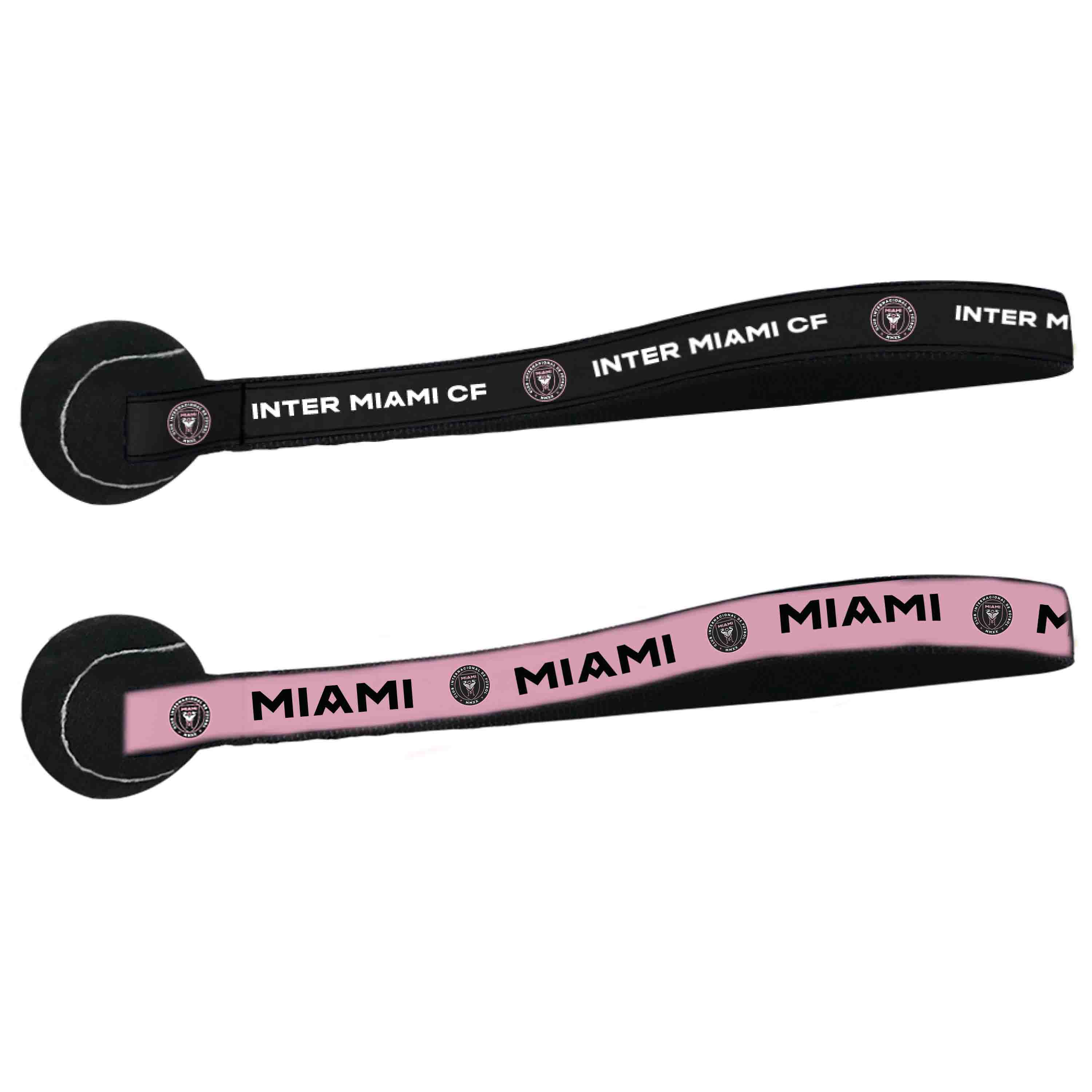 Custom black tennis ball toy includes a 100% Nylon webbing decorated with team logos on sublimated ribbon.