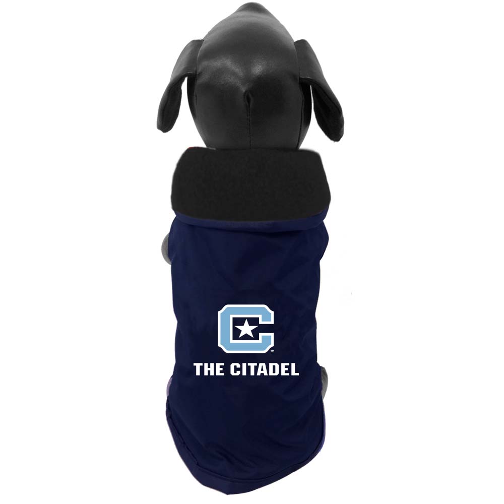 Water and wind resistant pet coat with polar fleece lining and embroidered team logo.