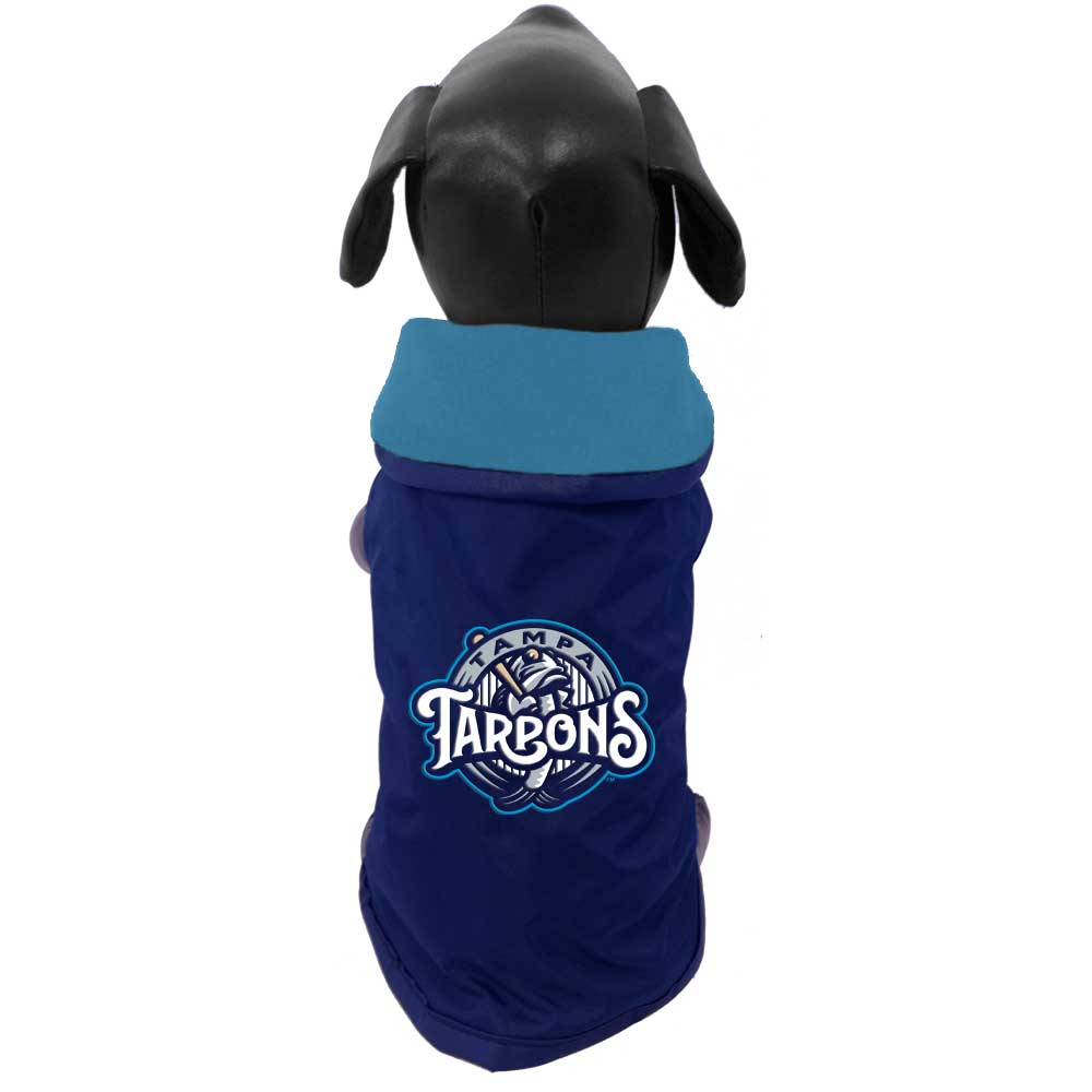 Water and wind resistant pet coat with polar fleece lining and embroidered team logo.