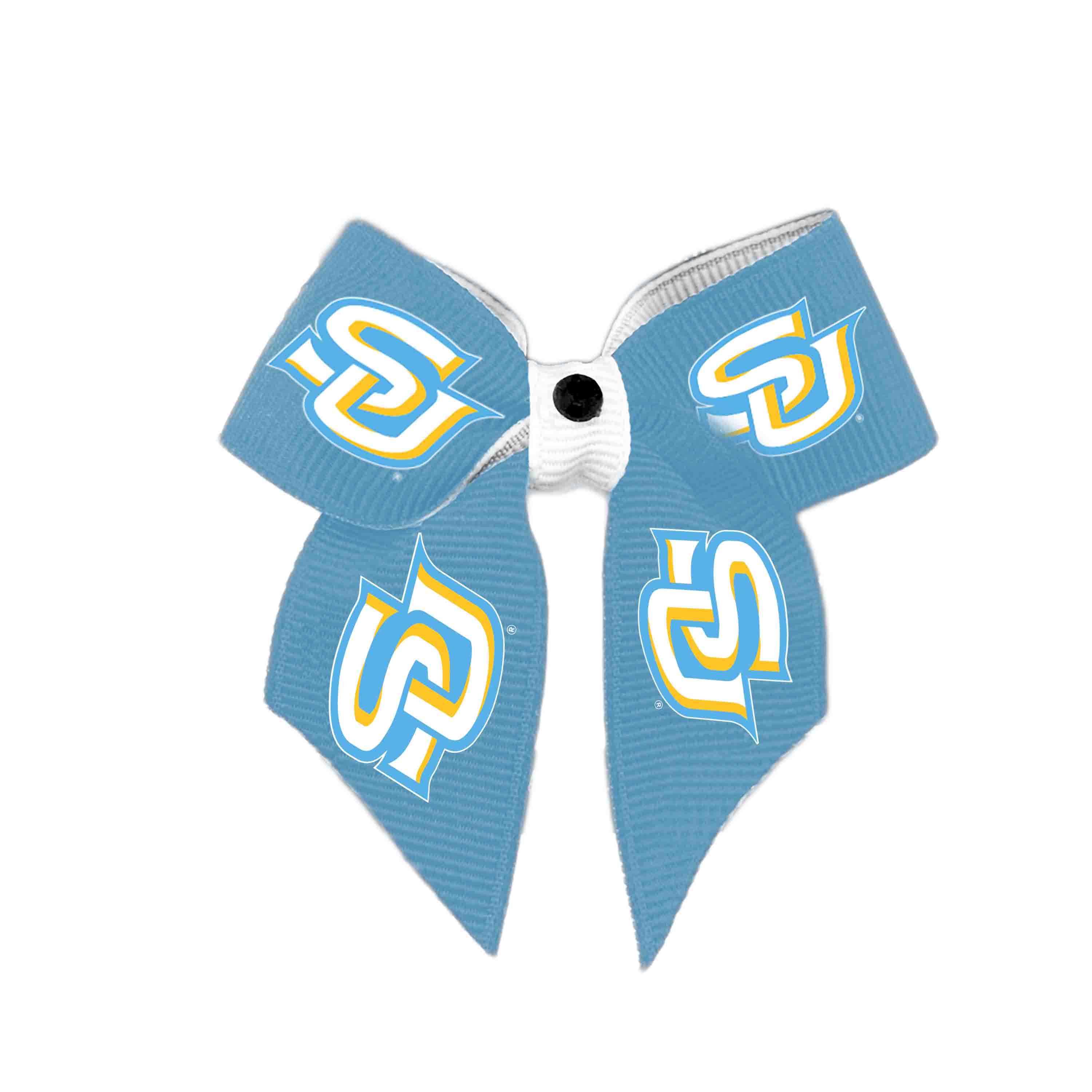 Grosgrain ribbon with printed team logo wrapped and jeweled with rhinestone and barrette closing.