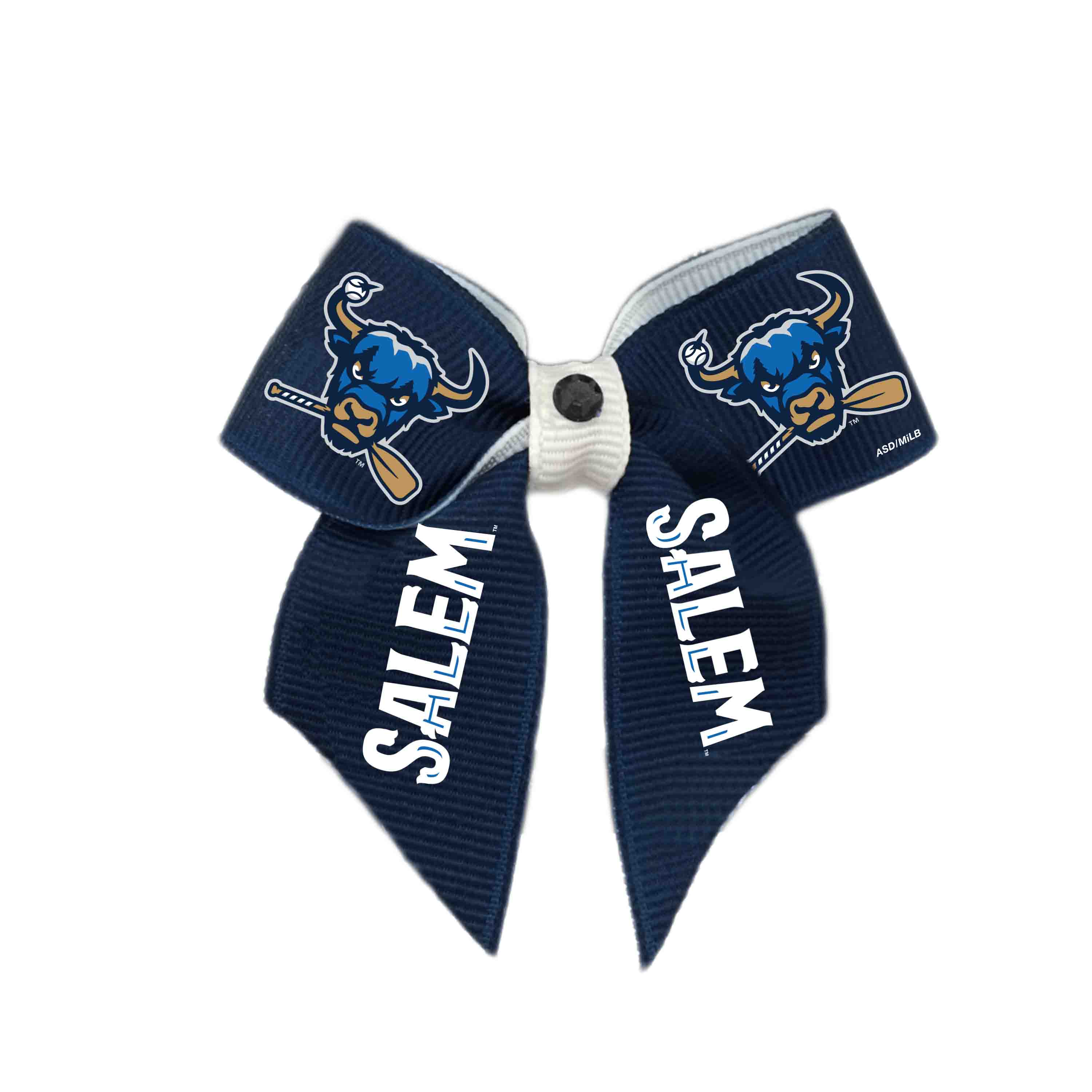 Grosgrain ribbon with printed team logo wrapped and jeweled with rhinestone and barrette closing.